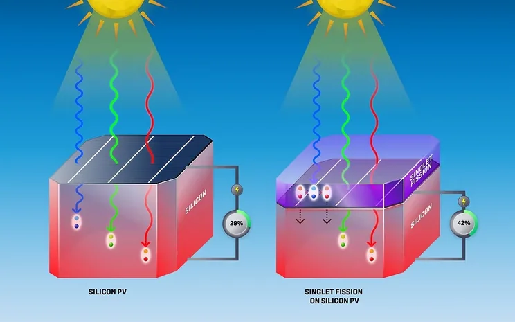 The University’s models suggest that adding a singlet fission layer could improve silicon solar cell efficiency by more than 10%.